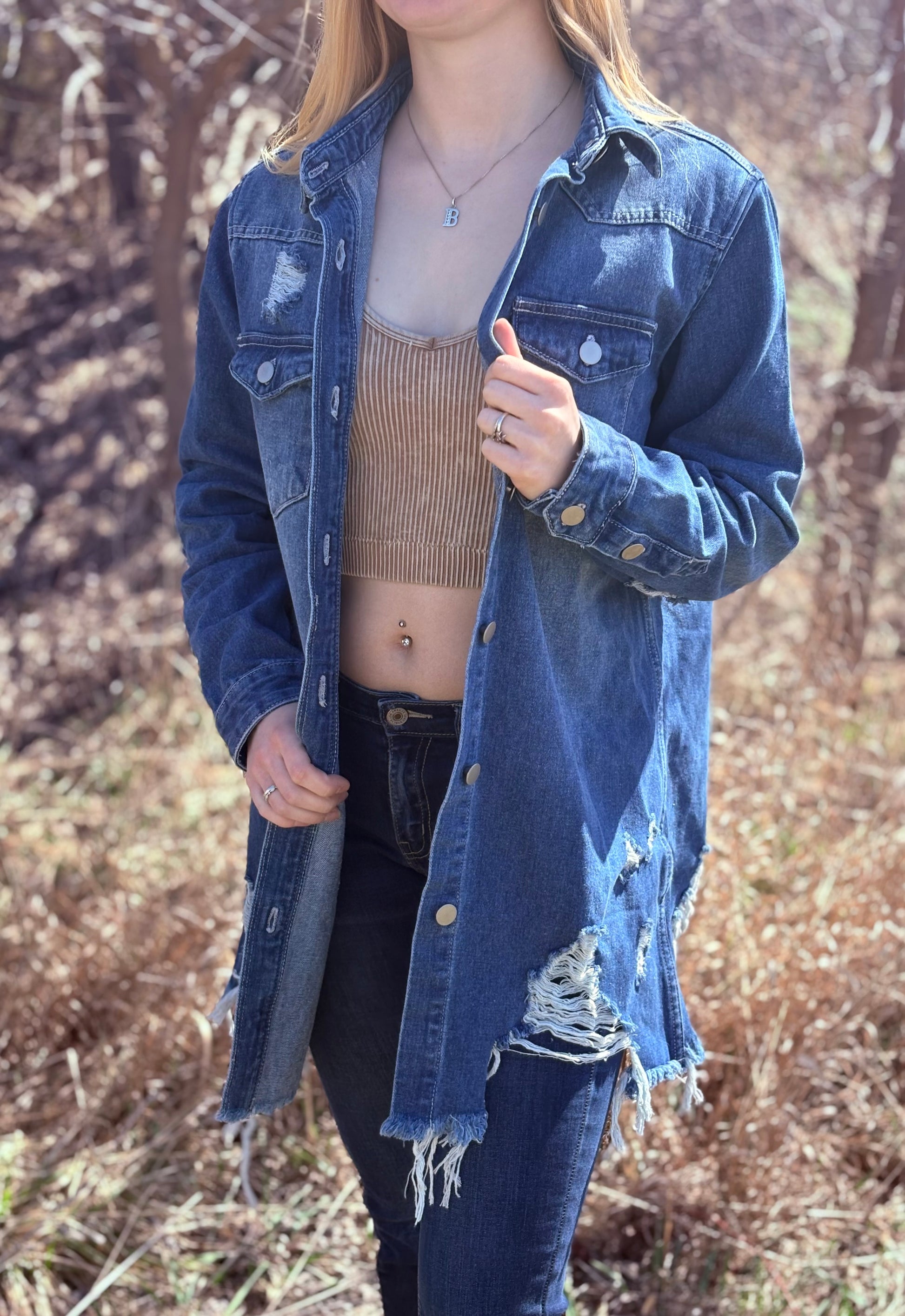 Get ready to hit the ranch in style with our Cattle Drive Denim Jacket. With its distressed flared ends and long silhouette, this jacket combines rugged charm with country chic vibes. Perfect for any outdoor adventure, this jacket will keep you looking and feeling great. Giddy up and get yours today!