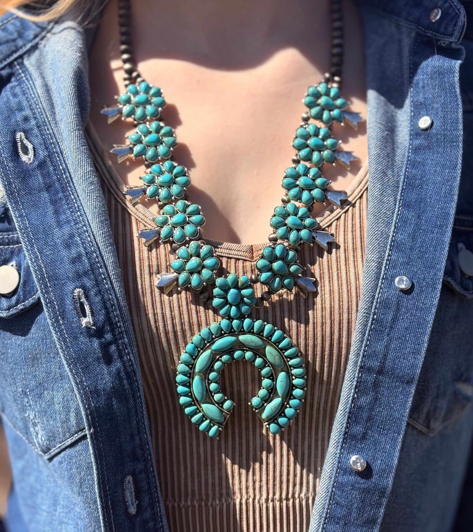 Elevate your style with the Montana Blossom Necklace! Featuring a Montana Squash Blossom design accented with vibrant turquoise, this silver piece adds a touch of western charm to any outfit. Complete your look with this beautiful and unique necklace.