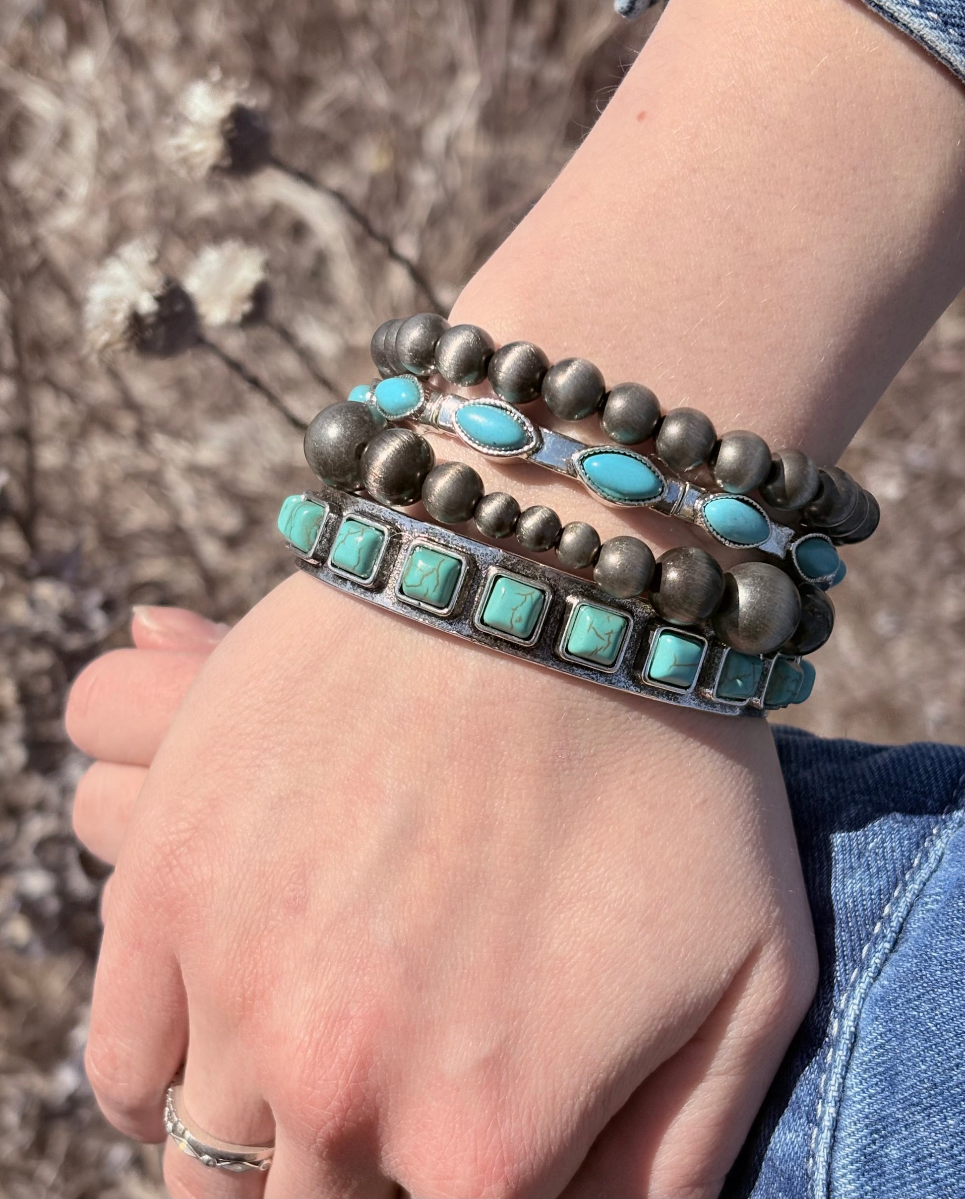 Embrace the essence of luxury with our Turquoise & Silver 4 Strand Bracelet Stack. Adorned with beautiful turquoise and delicate silver, this bracelet stack will elevate your western outfits to new heights of style and sophistication. A must-have for any fashion-forward individual.